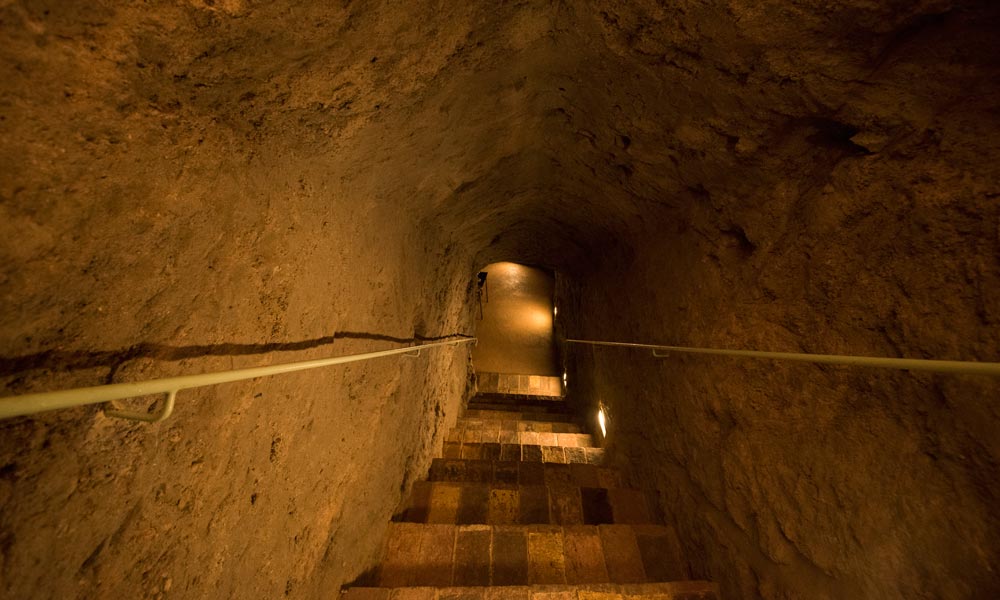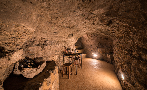 Si scende un piano sotto terra, per arrivare in una grotta illuminata ad arte con le luci "scavate" nelle pareti di roccia porosa, che crea un’atmosfera particolare.