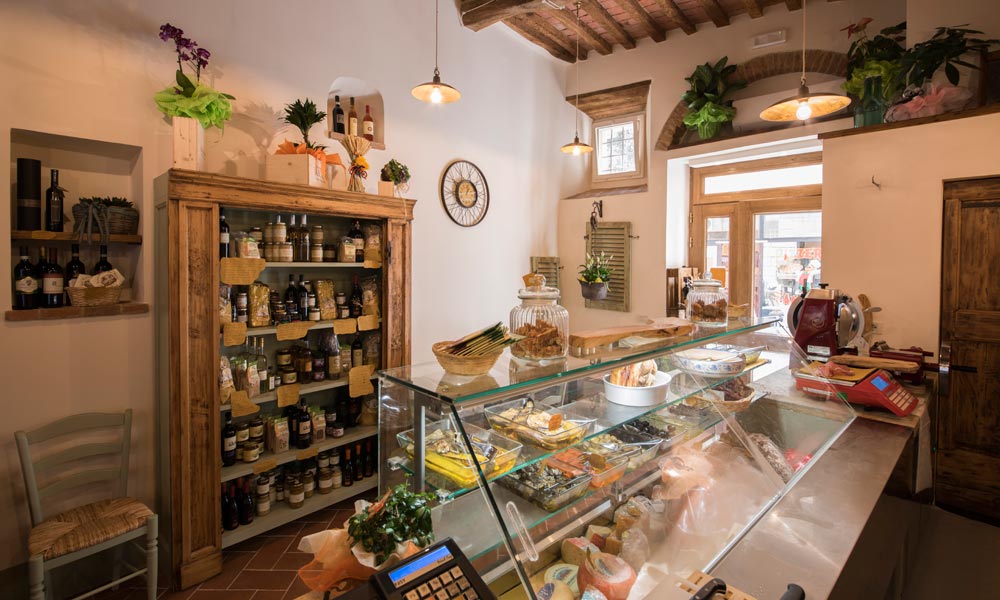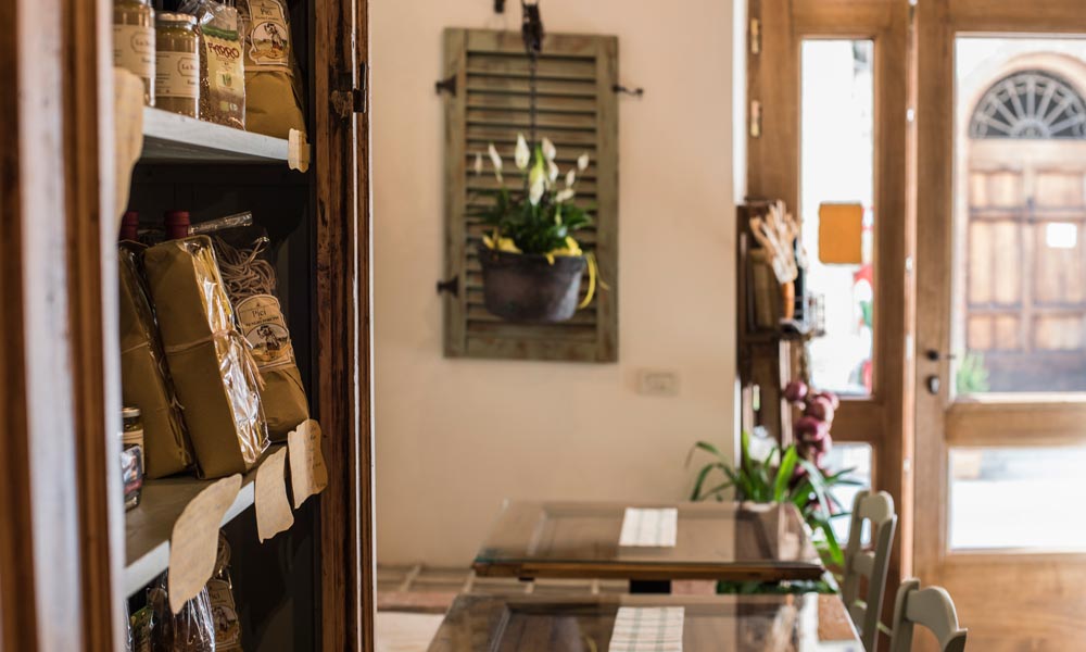 Sorge nella via principale del centro storico, arredata con colori naturali e chiari che s’intonano alle pietre secolari e al soffitto in mattoni e travi tipici toscani che danno a questo spazio un carattere nuovo in sintonia con i ricordi del passato.